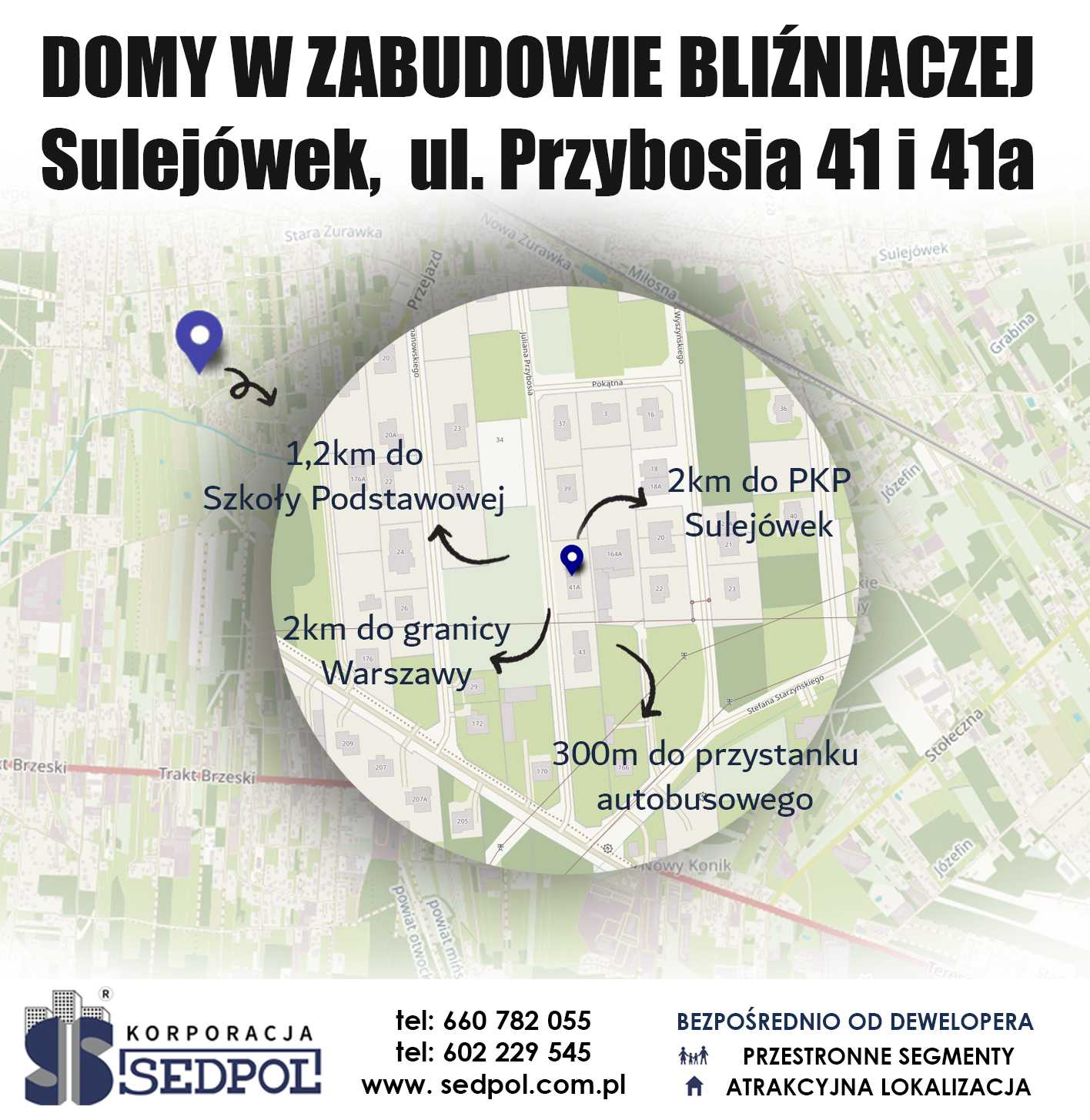 Z przyjemnością informujemy o zakończeniu realizacji kameralnej inwestycji przy ul. Przybosia w Sulejówku. Inwestycja obejmuje dwa budynki jednorodzinne w zabudowie bliźniaczej, powstałe w doskonale skomunikowanej i spokojnej części Sulejówka.